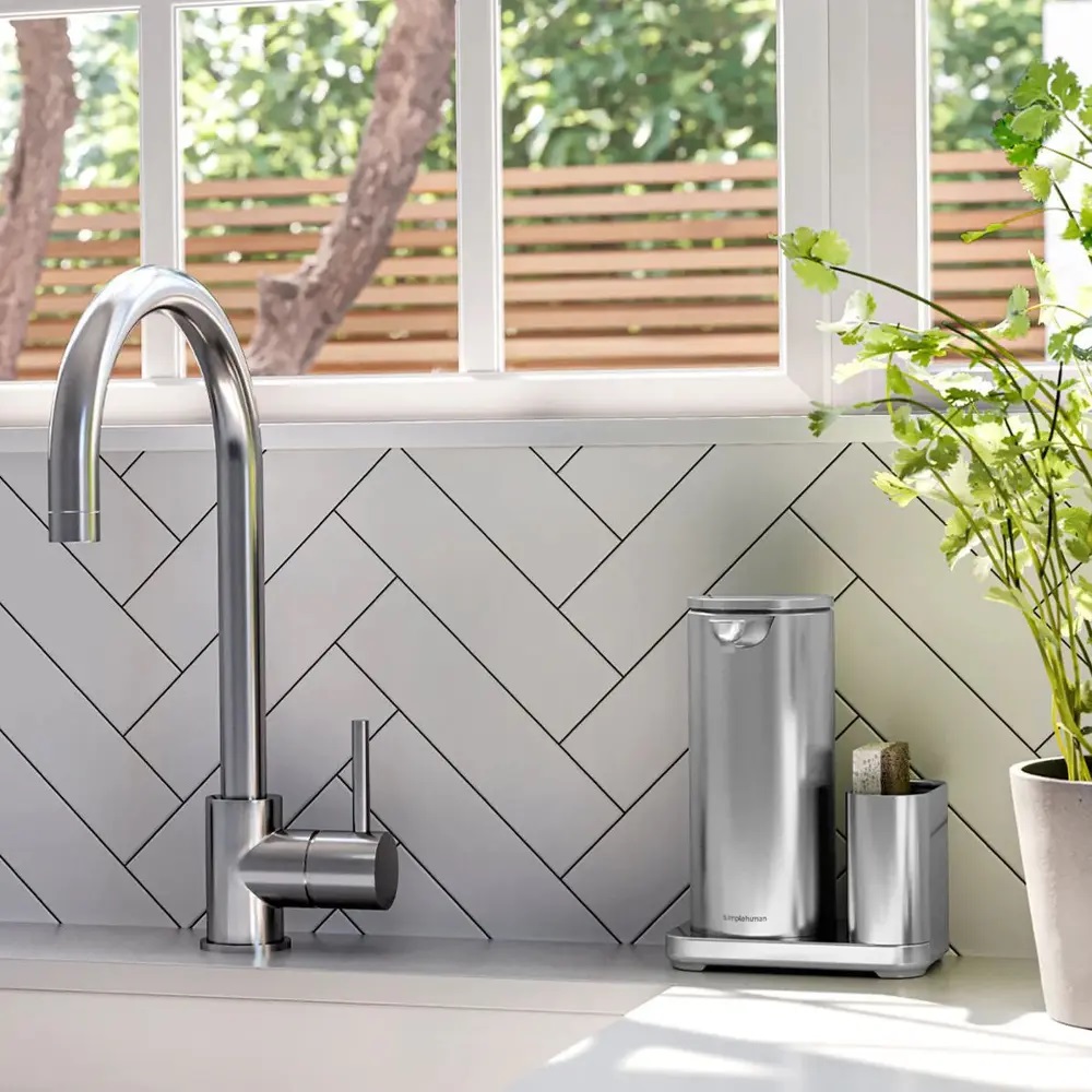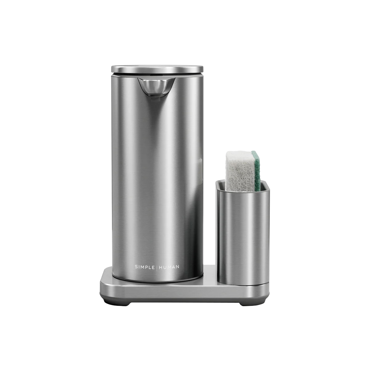 Оптимизиран за ефективно миене на съдове, диспенсърът включва държач от неръждаема стомана за съхранение на гъба за съдове, като я държи лесно достъпна. Той побира 50% повече сапун от стандартната помпа simplehuman , така че е необходимо да го пълните по-рядко.