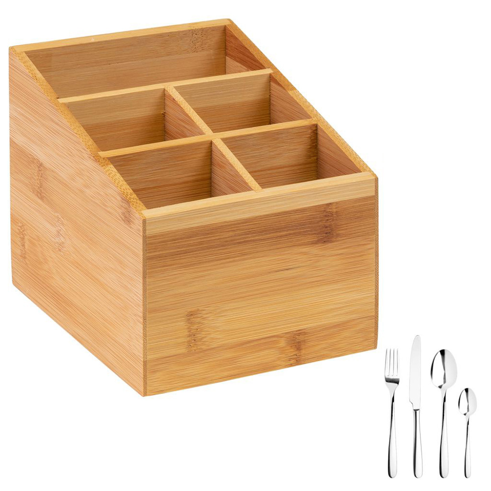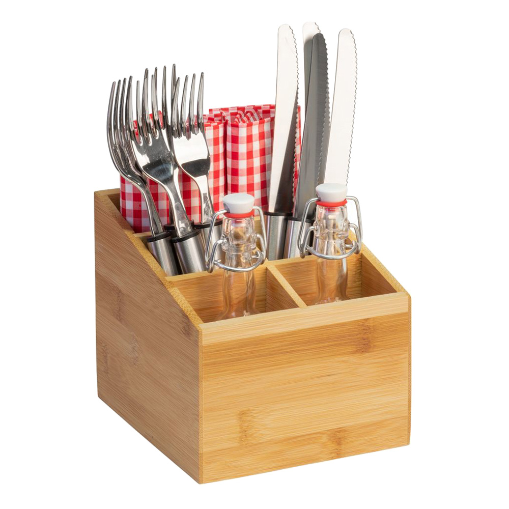 Този атрактивен бамбуков органайзер за прибори е подходящ за всяка кухня. Това е перфектният аксесоар за съхранение на прибори, подправки, салфетки и още много други.