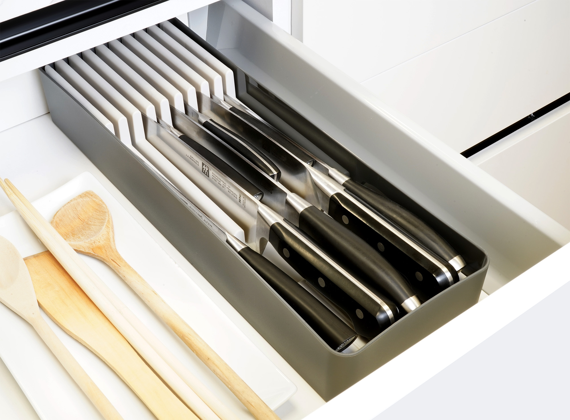 Пази ножовете в безопасност и поддържа кухненските чекмеджета подредени и организирани.
