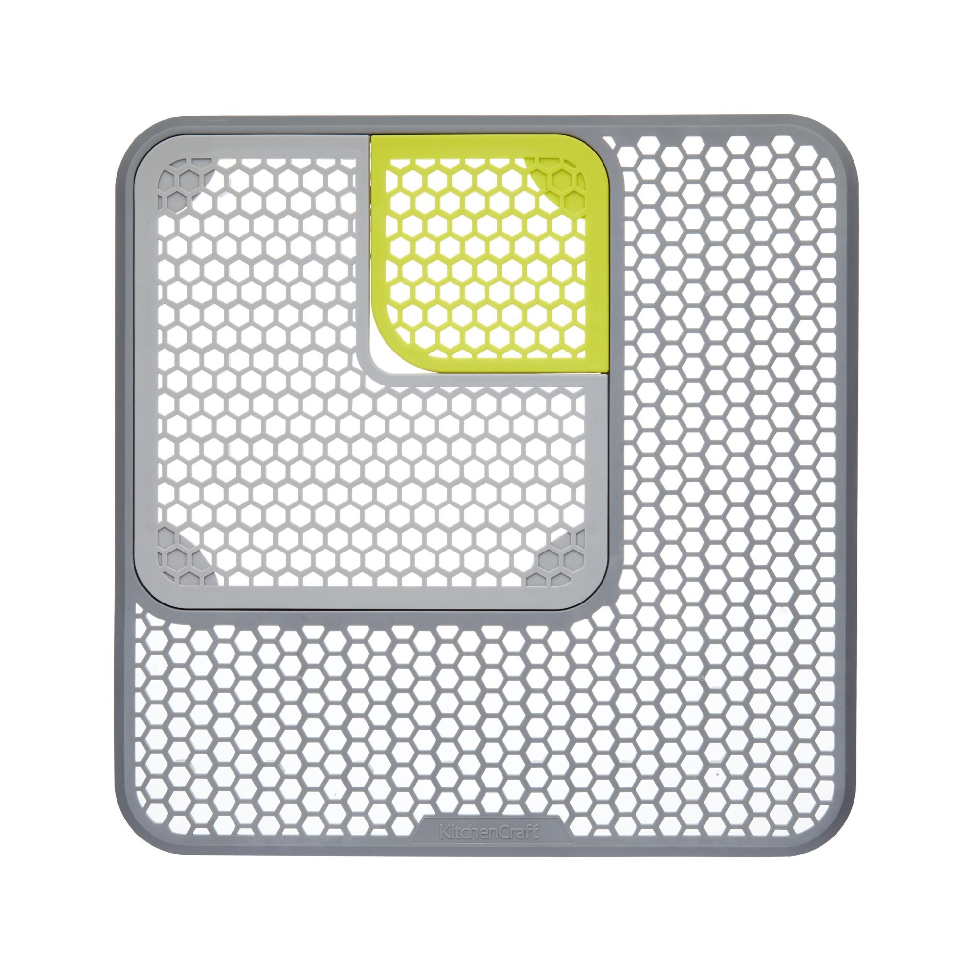 Пазете мивката, чашите, чашите и чиниите си в безопасност с тази иновативна подложка за мивка. Този модел предлага гениална интерпретация на традиционния дизайн на подложката за мивка. Състои се от три отделни, перфорирани части и е напълно регулируема, така че можете да сглобите частите според позицията на сифона на вашата мивка.